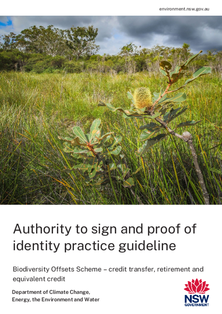The authority to sign and proof of identity requirements have been established by the Department of Climate Change, Energy, the Environment and Water in relation to Biodiversity Offsets Scheme credit dealings – transfers, retirements, and assessment of reasonable biodiversity credit equivalence.